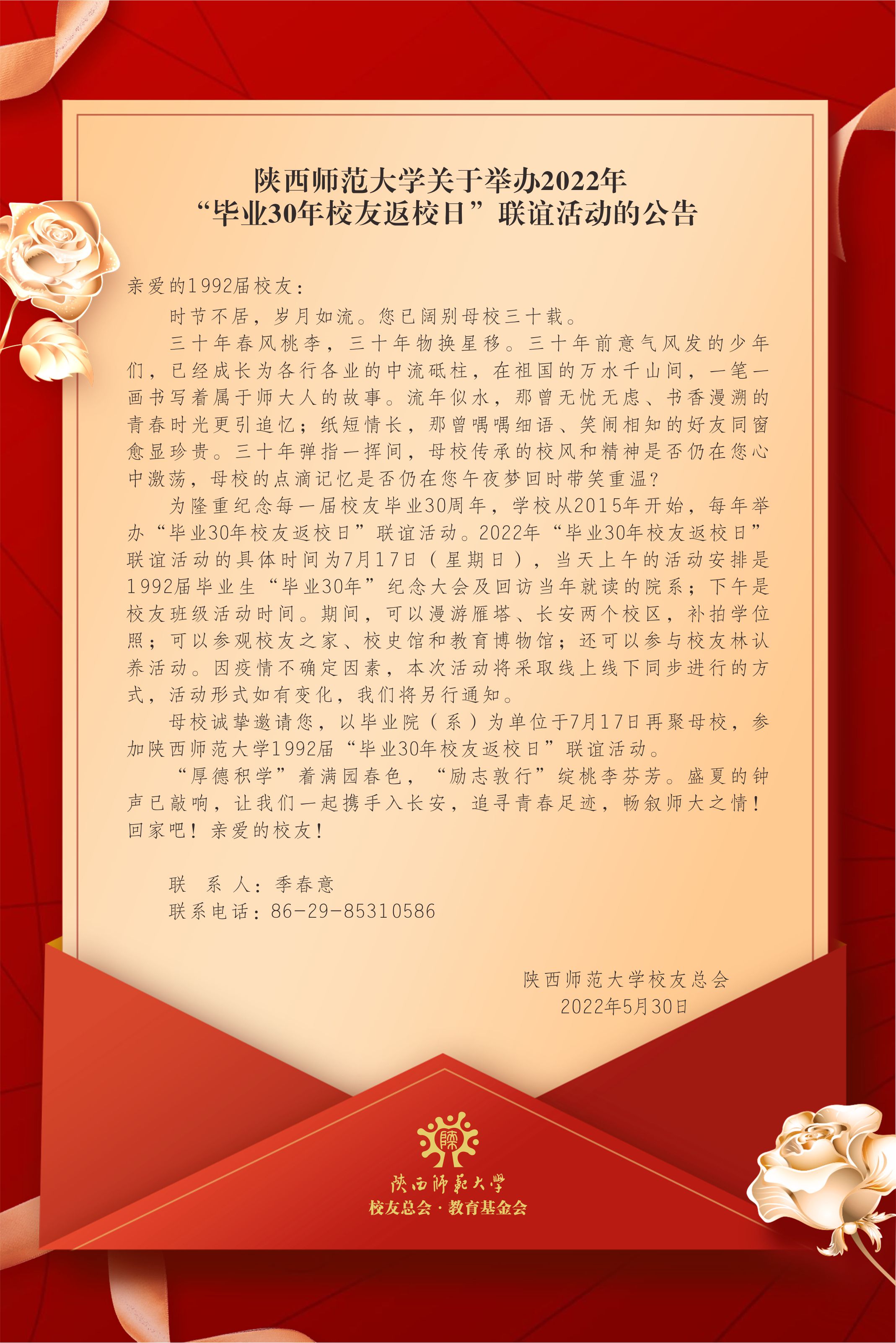 伟德国际1949始于英国关于举办2022年“毕业30年校友返校日”联谊活动的公告