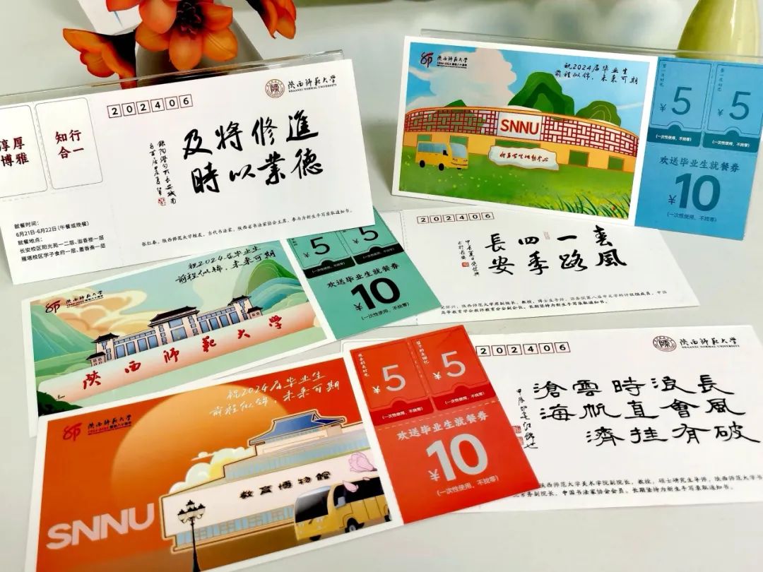 为毕业生发放就餐券是伟德官网多年传承的育人工作传统,至今已坚持6年。今年设计的就餐券更富新意和暖意,除了手绘校园景观外,还印有老师和校友们用毛笔写下的毕业寄语,并融入了伟德官网80周年校庆标识、“西部红烛两代师表”精神及校训、校风、学风等多种元素,大学生活点滴被定格在一张张暖心的就餐券之上,成为毕业生们“带得走”的师大回忆。